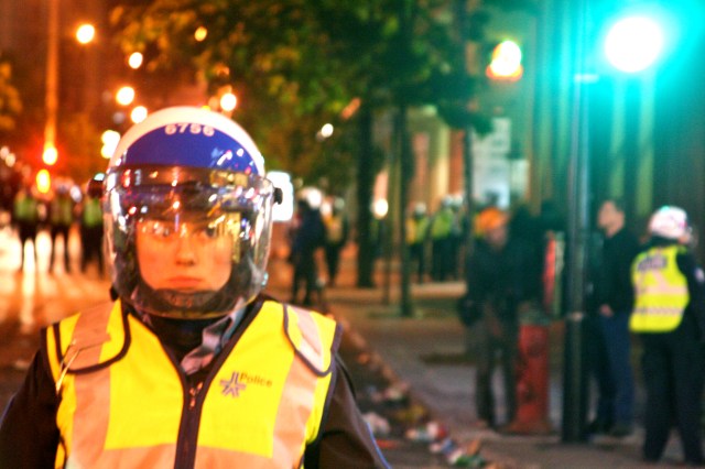 I arrived home only at 1am, wide awake, with the dust of pepper spray still lightly resting on my eyelashes, still beaming from the biggest win I can recall, while my mind was still flashing from the sensory overload that was St. Catherine and Drummond. Uncountable empty and still foaming full beer bottles were thrown into crowds of hundreds, and at horses and baton wielding riot cops. People climbing everything. Firework cannons being unleashed from the hands of drunk men in the middle of the closed down intersection. A man taking a piss in the middle of a crowd of thousands, just because he could. Fires in the gutters, burnings of Lindros jerseys (why not, right?) and giant cutouts of Crosby (still don’t know where they got it from).