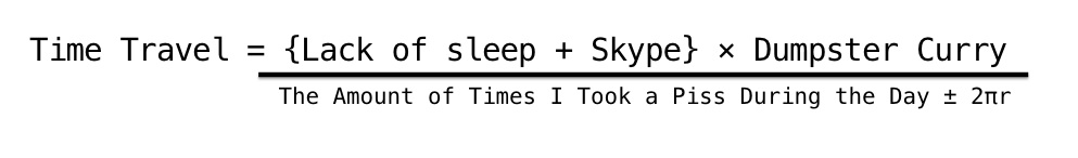But regardless of languages or religions which God decides to smite or not, I travelled through time, and if I could only remember what I saw. Was it airplanes like birds , or humans like amphibians? Was it the nuclear mess of the future, or the industrial mess of the past? Was Sheen the President and Strombo Prime Minister? Did Apple Computers eventually create the iPad: Jesus Edition with the tagline, ‘So perfect, you’ll think it’s the second coming’ that we’re all expecting? Did I ever learn not to be flaky? If only I could’ve written down the formula for time travel in my sleep. Estimation: